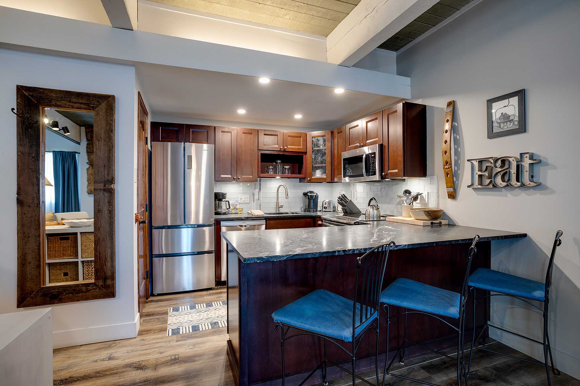 Inside, no detail has been overlooked. The space is warm and inviting, featuring rich wood accents, modern finishes, and thoughtfully curated furnishings. This is the perfect space to relax and reconnect in the mountains.