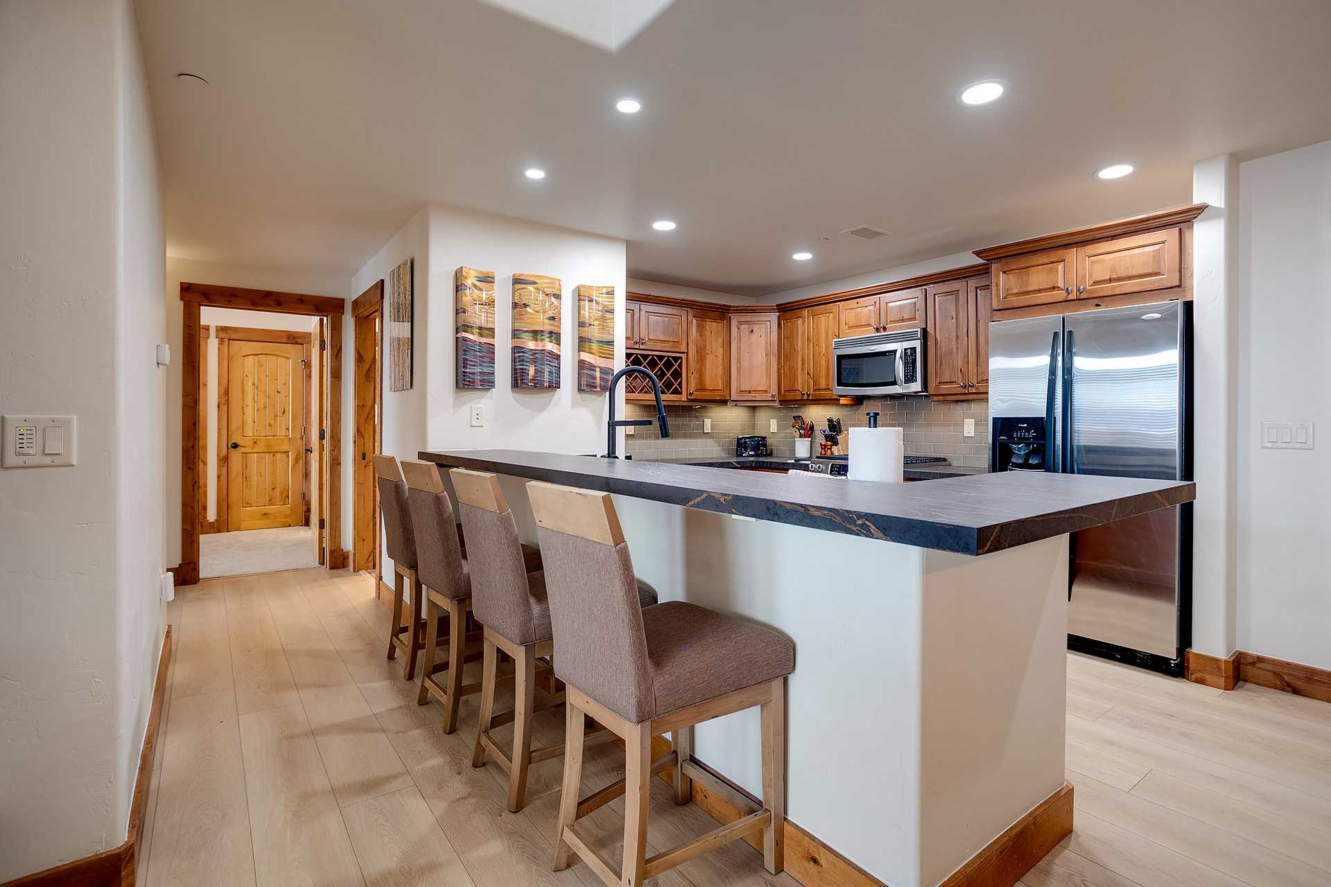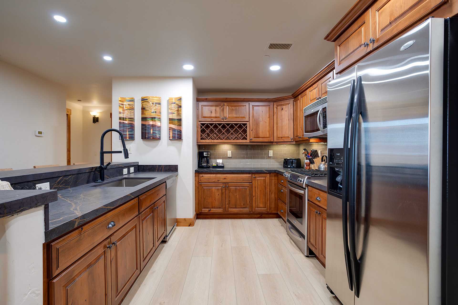 EL5301 features 3 bedrooms and 3 bathrooms, with lovely primary suite with king bed and ensuite with jetted tub. Professionally decorated with exceptional attention to detail, you’ll enjoy beautiful furnishings and high-end finishes throughout. The living and dining space features cozy gas log fireplace and enjoys a south-western aspect giving you wonderfully light and sunny living spaces, as well as a balcony with valley views. The fully equipped and spacious gourmet kitchen, with alder cabinetry, has a sociable breakfast bar with slab granite countertop and the quality stainless steel appliances plus a 4-burner gas cook-top stove. Located just 2 blocks from the Gondola and Mountain Village, enjoying on-demand winter shuttle service, and amazing onsite amenities, you have everything on your doorstep for a simply great winter or summer vacation.