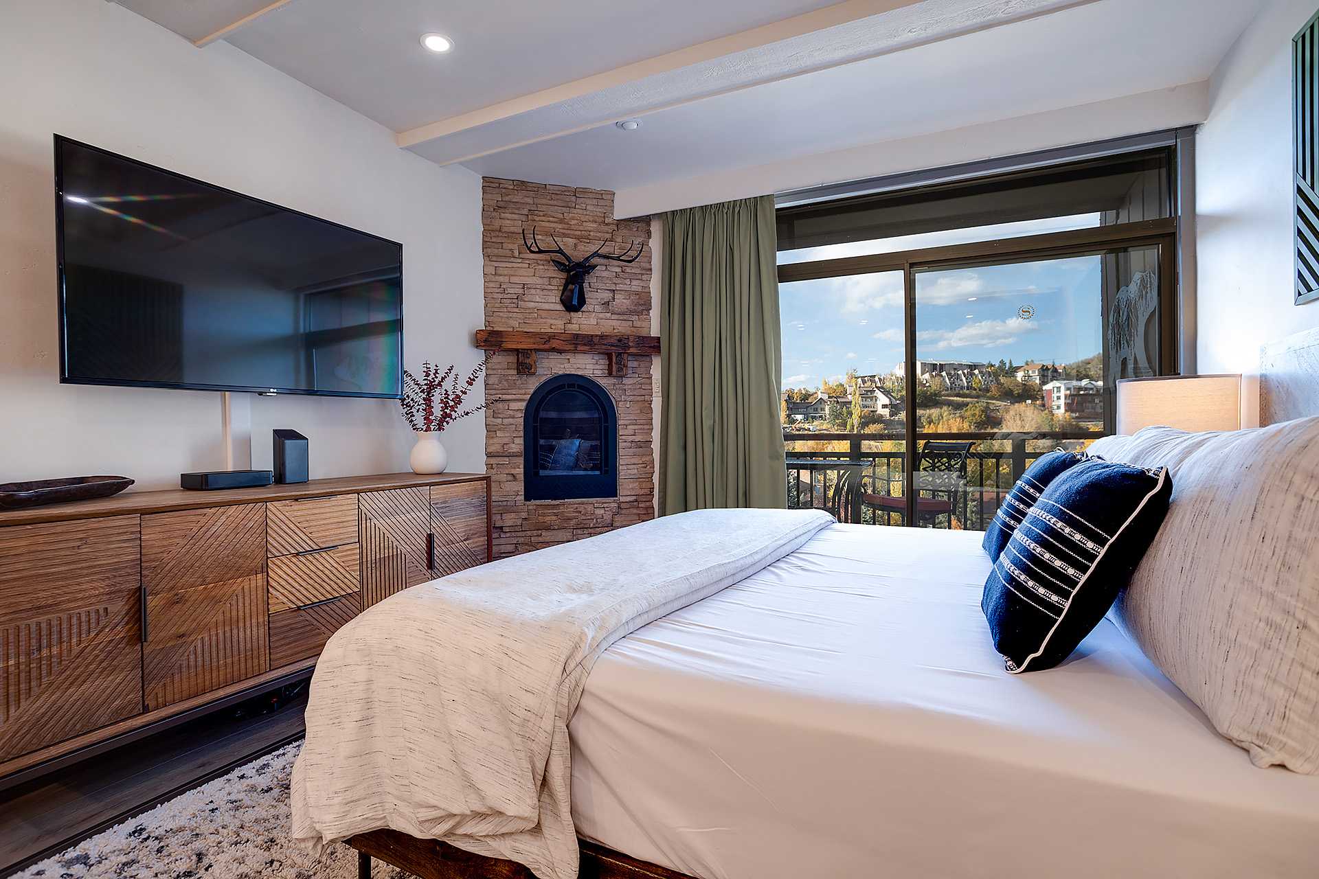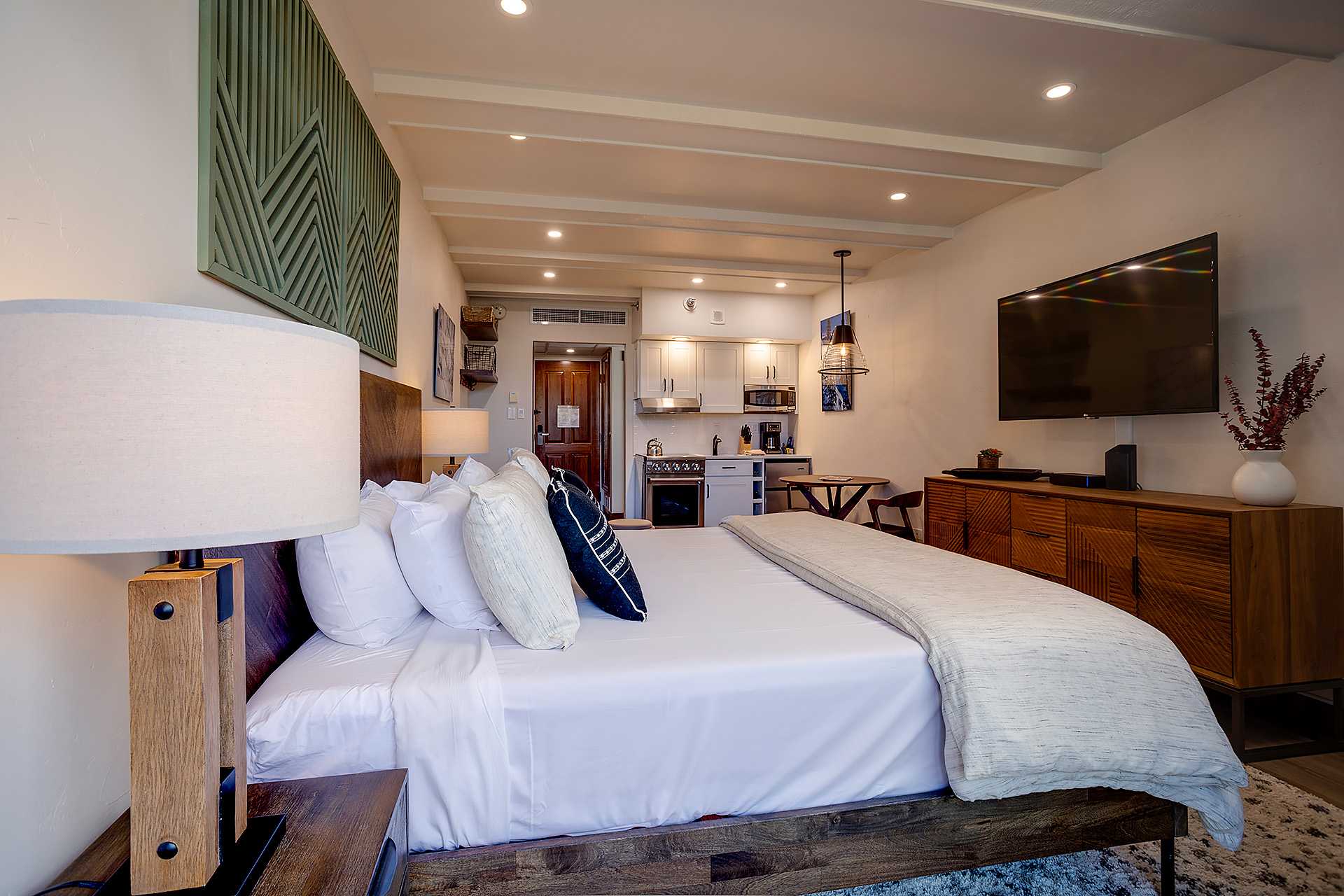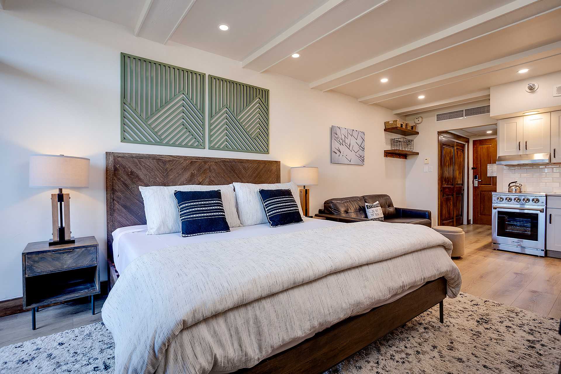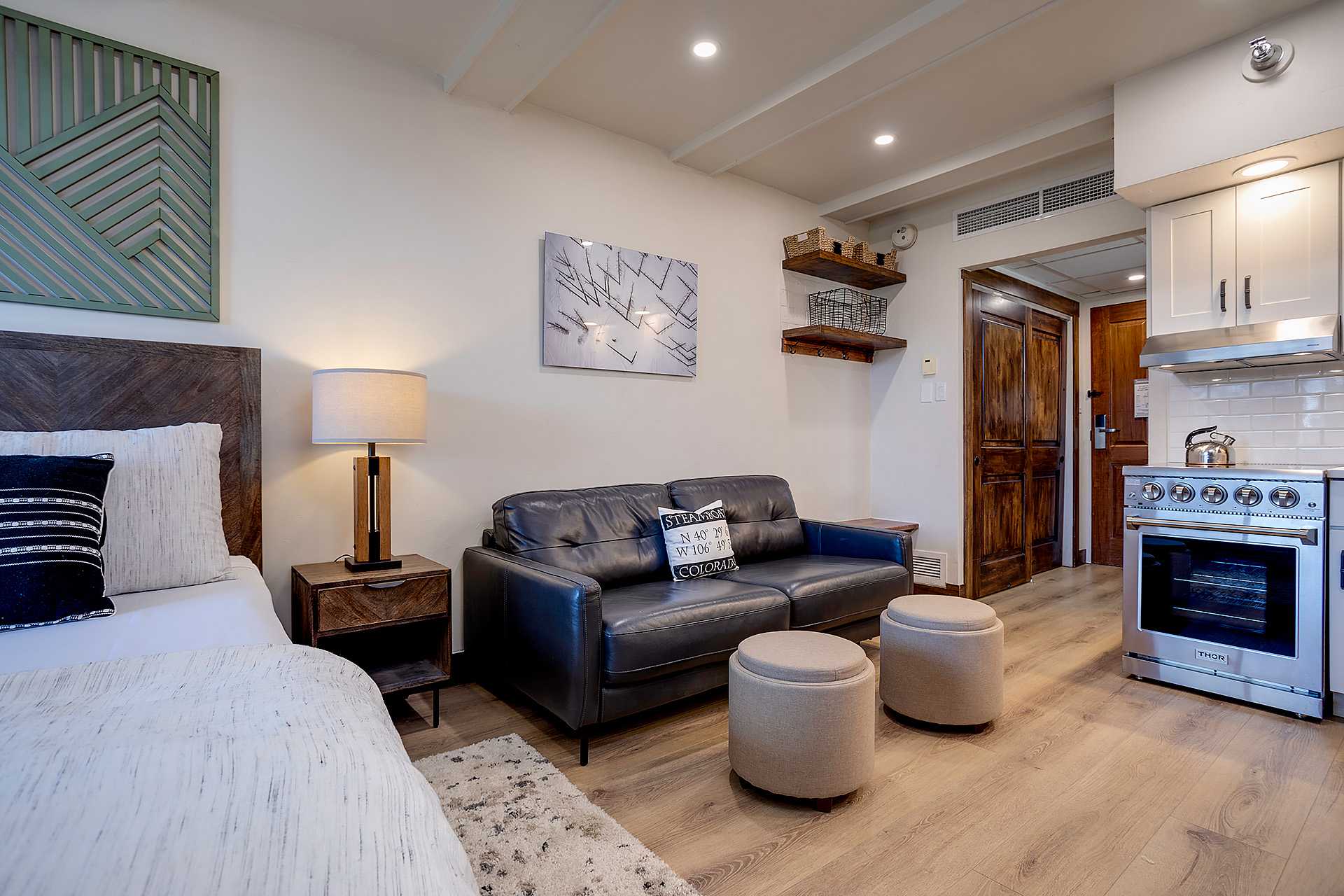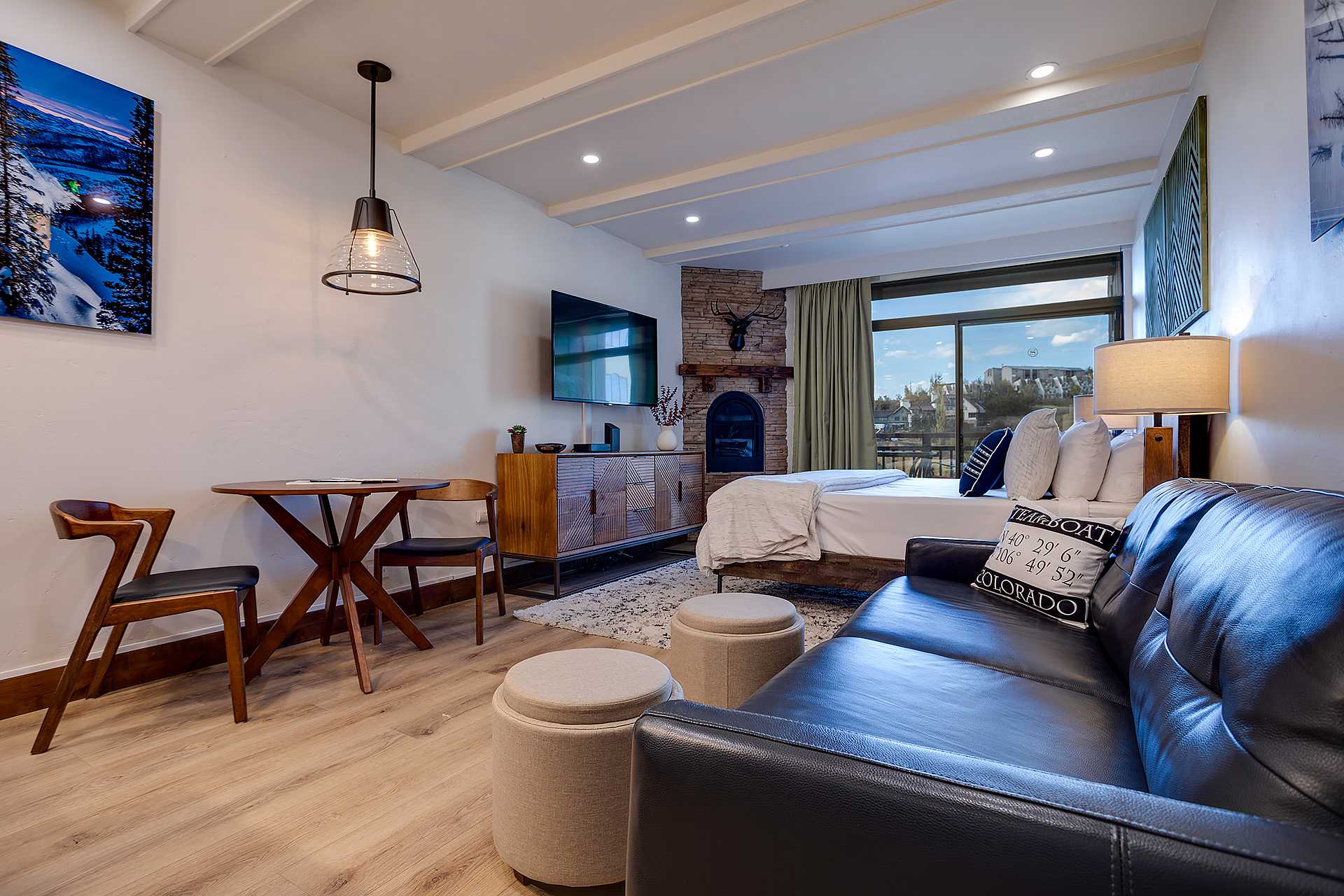 SV602 offers an updated space with gorgeous local artwork with inspiration from our surrounding mountains. A studio with all that you need for a short or extended stay in the mountains. Steamboat Village Inn Condominiums 602 features a gas fireplace, flat screen TV, air-conditioning, and private balcony. The kitchenette is equipped with range, microwave, and bar fridge.